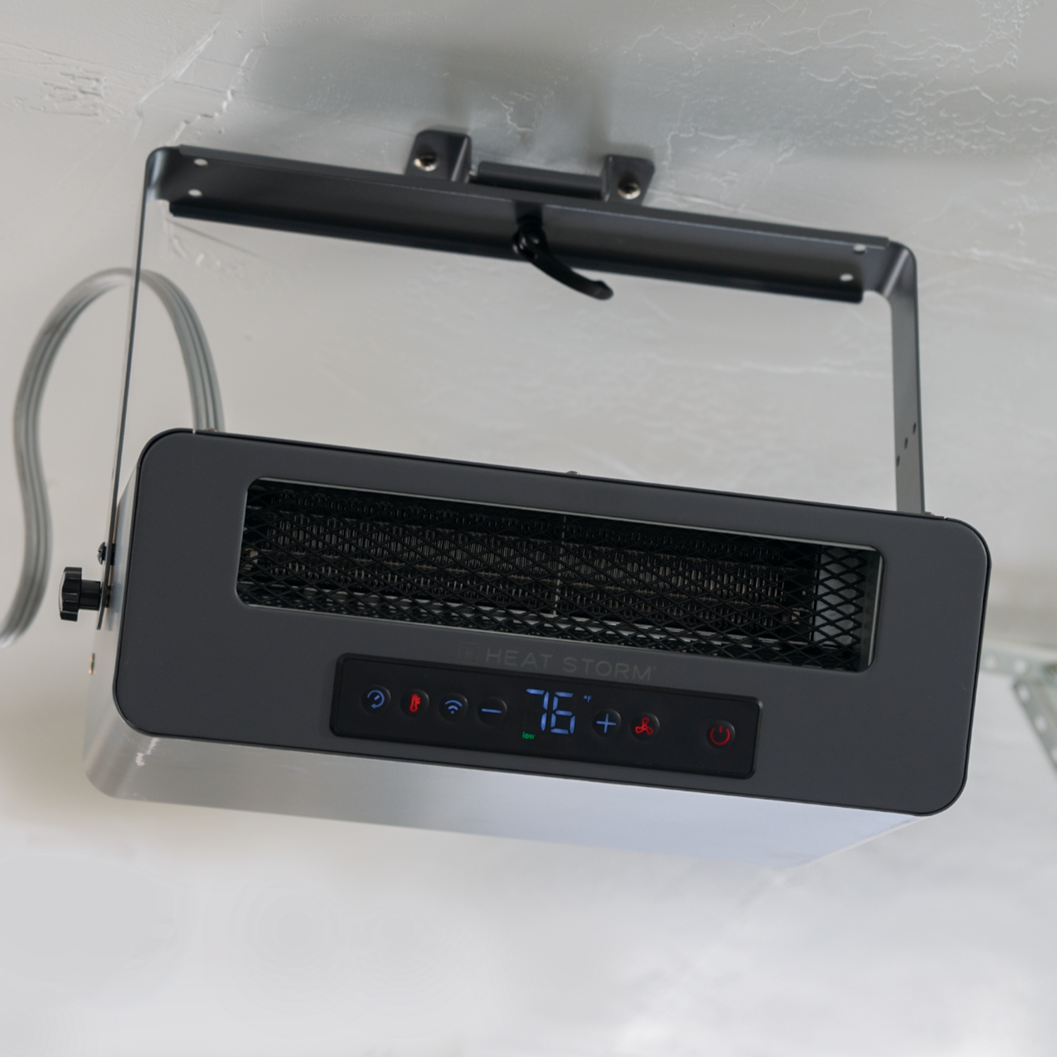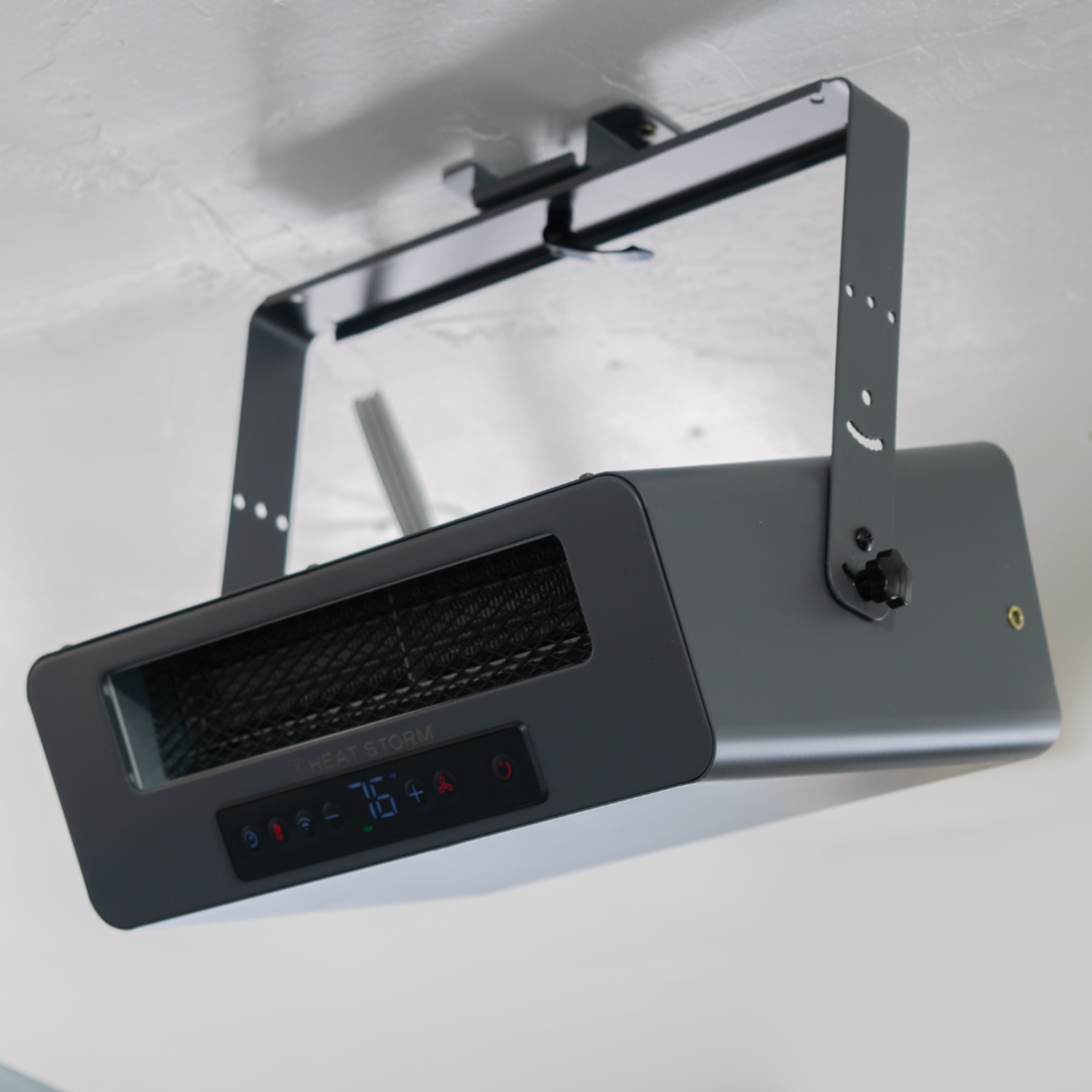 The Heat Storm 6000-watt Garage Wi-Fi Heater is a great solution for any garage, workshop, basement, or area with limited floor space. It mounts on the wall or on the ceiling. At 6000 Watts, this heater will easily heat up your garage, basement, or shop up to 1000 square feet. It does need to be hardwired in, so you may need to hire a certified electrician to get it installed.